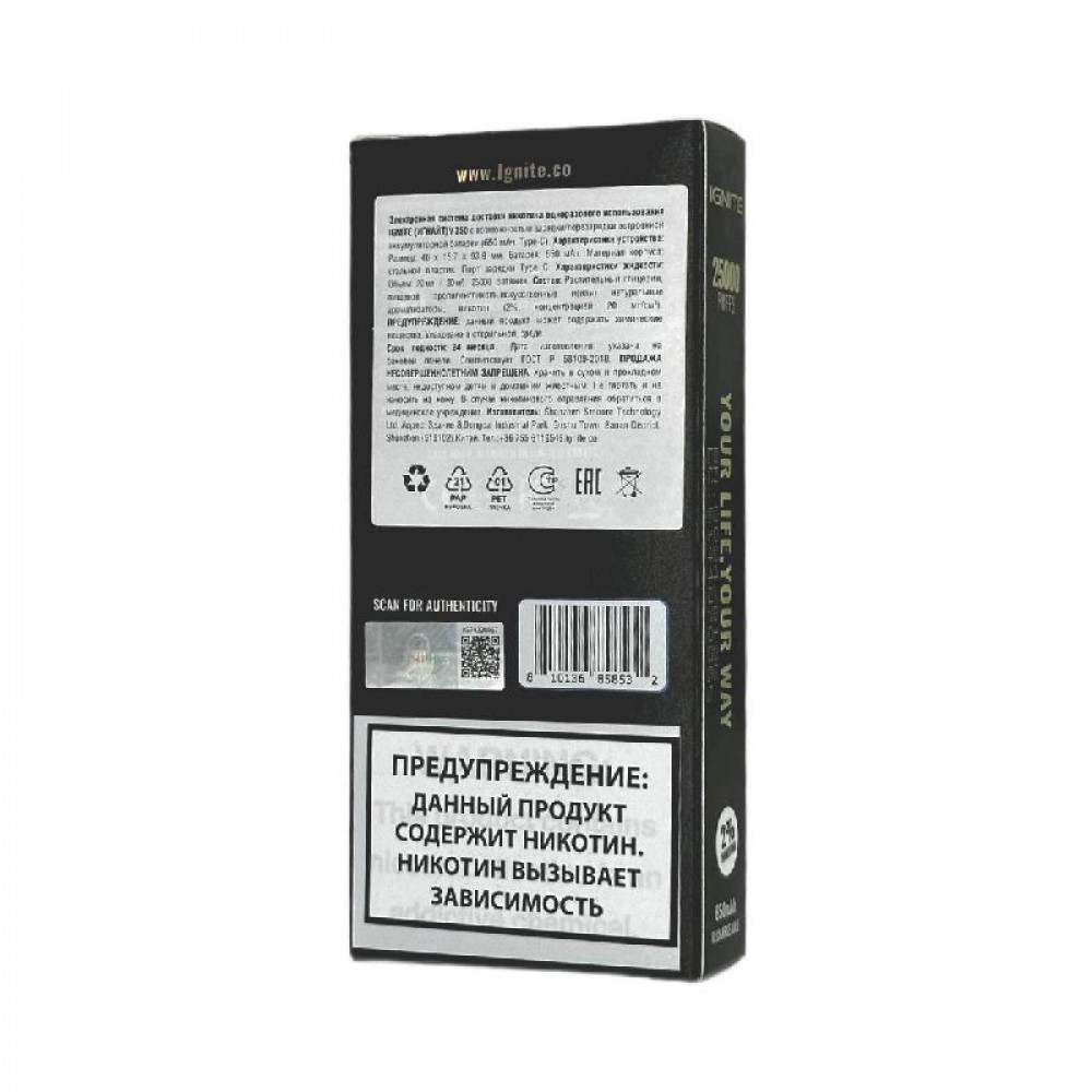 Технические характеристики Электронная сигарета Ignite V250 Gold 25000 - Aloe Grape Ice (Алоэ виноград лёд)